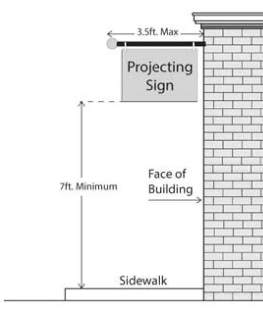 Sign, Projecting: A sign that is affixed to any building wall or structure and projects perpendicularly more than 12 inches from the building wall.