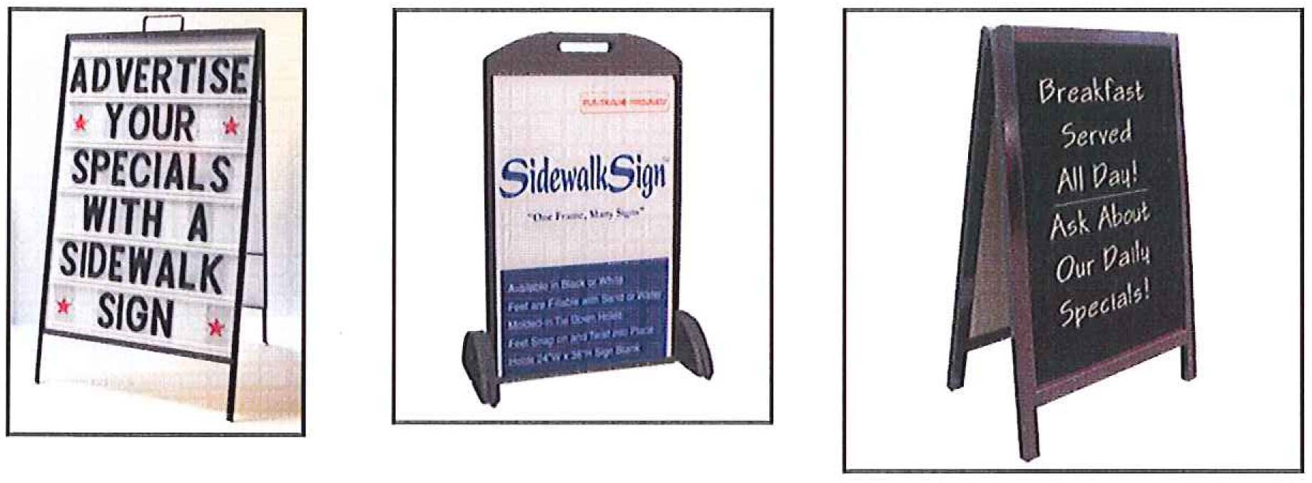 Sign, Sidewalk (sometimes referred to as a sandwich board sign): Any freestanding, self-supporting, single or double faced sign which is designed to be placed upon, but not affixed to, the ground, or sidewalks or pavement, and that is portable and readily moved from place to place.