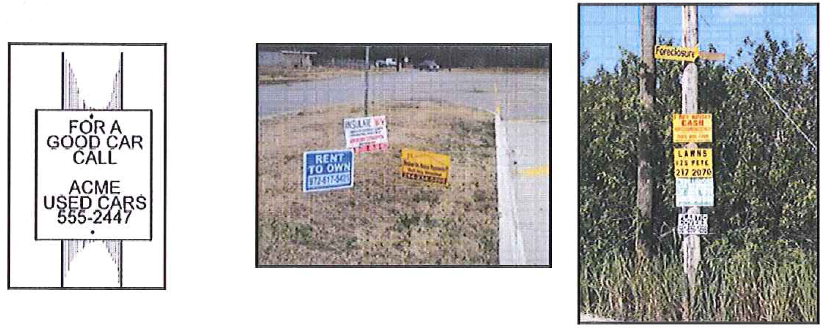 Sign, Snipe: A temporary sign not otherwise defined in this article that is tacked, nailed, posted, glazed, or otherwise affixed to a light fixture, utility pole, public building, fence, railing, public telephone pole, traffic control device, public bench, tree, or to the ground.