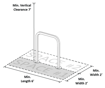Dimensions. Each bicycle parking space must have a minimum width of two feet, minimum length of six feet, and minimum vertical clearance of seven feet, see Figure 10.03-1 Bicycle Parking Design.