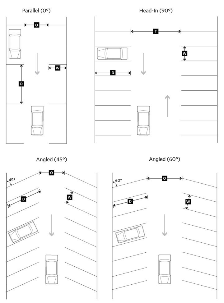 Dimensions. All off-street parking aisles and spaces must be designed in compliance with the requirements established in Table 10.04-1 Off-Street Parking Dimensions and Figure 10.04-1 Parking Lot Layout.