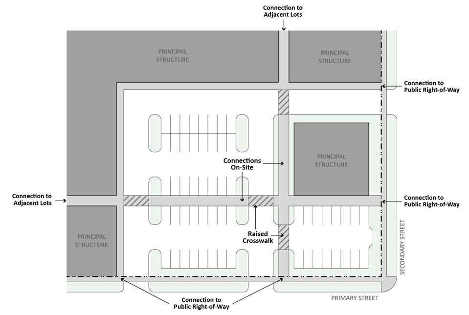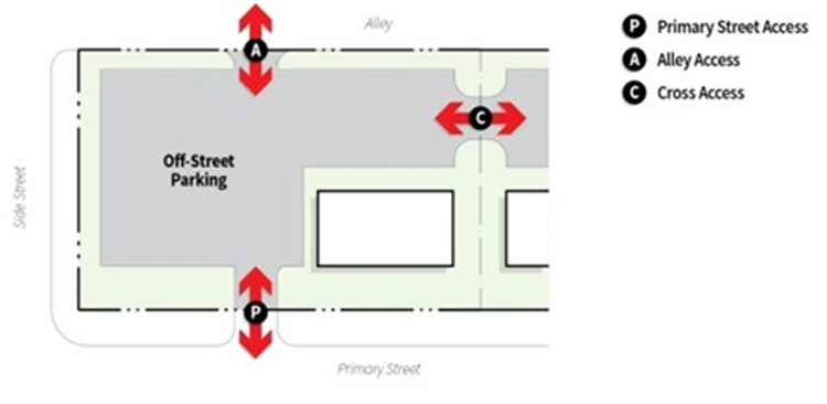 Pedestrian Cross-Access. Where sidewalks are not present, mixed-use and non-residential uses are required to provide pedestrian cross-access to allow circulation between adjacent sites, see Figure 10.04-2 Off-Street Parking Access.