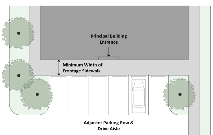 Frontage Sidewalk. A sidewalk with a minimum width of five feet is required along the full length of any building frontage containing a primary entrance that is directly adjacent to a parking row, driveway, or drive aisle. For parking lots with more than 150 parking spaces, a minimum width of ten feet is required. Refer to Figure 10.05-2 Frontage Sidewalk.