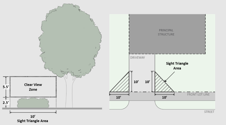 Visibility. No building, structure, sign, or landscape element that is more than 50 percent opaque may obstruct the area between two and a half feet and eight feet in height within the sight triangle area on each side of any driveway. Beginning at the intersection of the driveway with the lot line, the sight triangle is formed by measuring ten feet along the lot line in the opposite direction of the driveway and ten feet along the driveway in the opposite direction of the lot line, then connecting the endpoints of the lines across the subject lot (refer to Figure 10.06-1 Visibility at Driveways).
