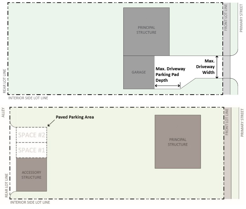 Driveway Parking Pad. A parking pad the width of the garage served by the driveway is permitted to extend up to 20 feet in depth from the garage doors before tapering back to the required driveway width. A parking pad accessed from an alley may extend up to 20 feet in depth from the adjacent lot line. Alley-accessed parking pads may only extend up to 20 feet in width, see Figure 10.06-3 Driveway Parking Pad Width.