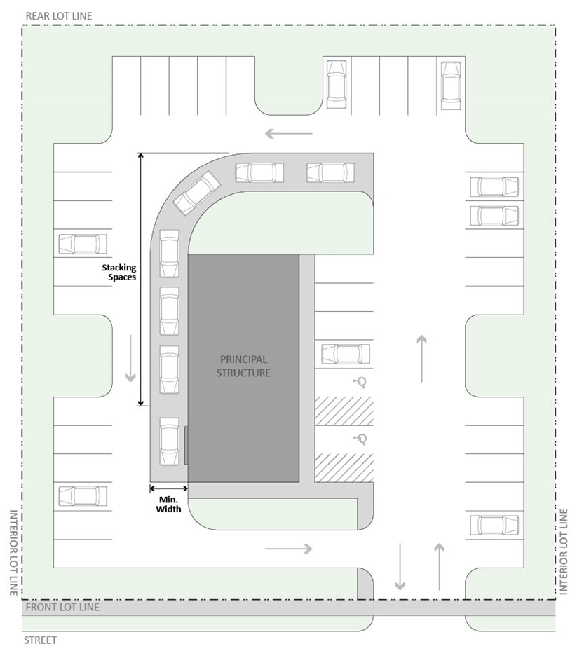 Location. Stacking spaces must be located behind the vehicle parked at the last point of service, such as a drive-through window, and placed in a line within the drive-through lane. Stacking spaces must be located so that they do not obstruct access to the site or to parking and loading spaces. Refer to Figure 10.07-1 Stacking Spaces.