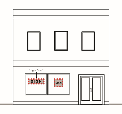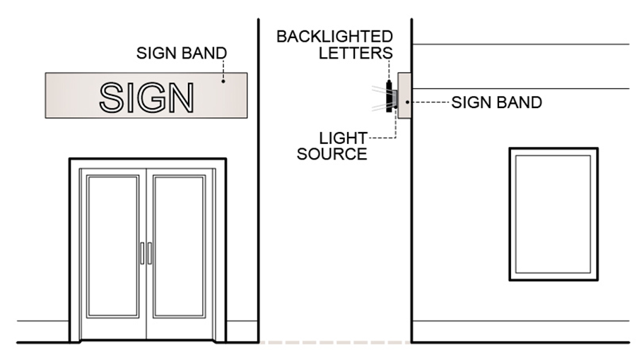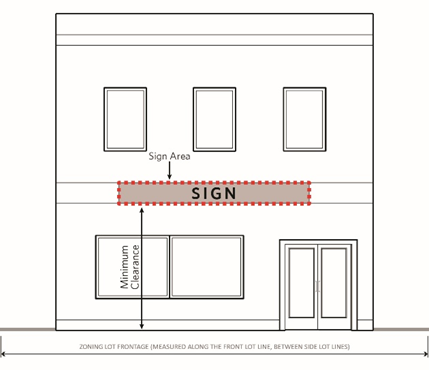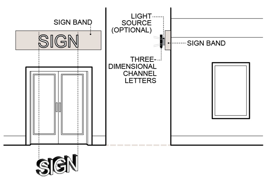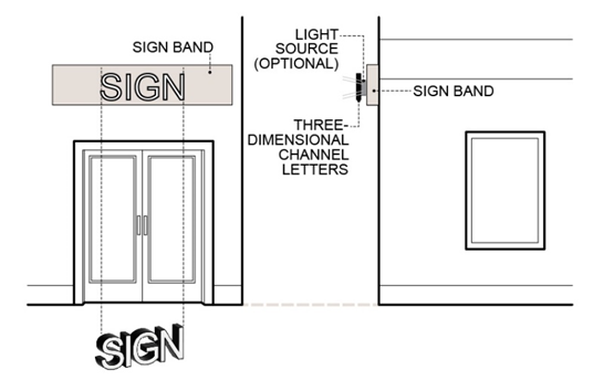 Sign Band: The horizontal wall area that is located above the ground floor storefront opening and below the second-floor line and is located a minimum of eight feet and a maximum of 15 feet above grade.