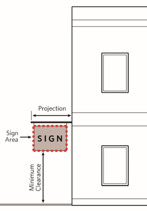 Blade Sign: A double-faced sign that projects perpendicular to the building façade and is suspended by or attached to a single decorative (non-industrial) bracket. Blade signs are primarily oriented towards pedestrians.