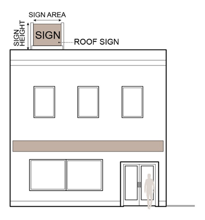 Roof Sign: Any sign erected or constructed on or over the roof of any building or other structure or which extends above the cornice line of the building upon which it is located and supported in whole or in part by such building or structure. Roof signs are prohibited in the City of Waukegan. See Figure 13.02-25 Roof Sign.