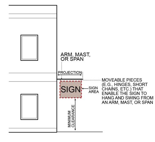 Swinging Sign: A sign that is attached to an installed arm, mast, or span that is able to swing or hang. See Figure 13.02-27 Swinging Sign.