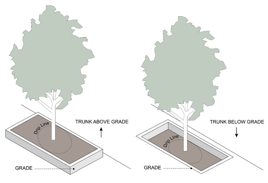Tree Well: An area that surrounds the tree at the drip line, where the trunk of the tree is either above or below the average grade outside the drip line. See Figure 13.02-28 Tree Well.