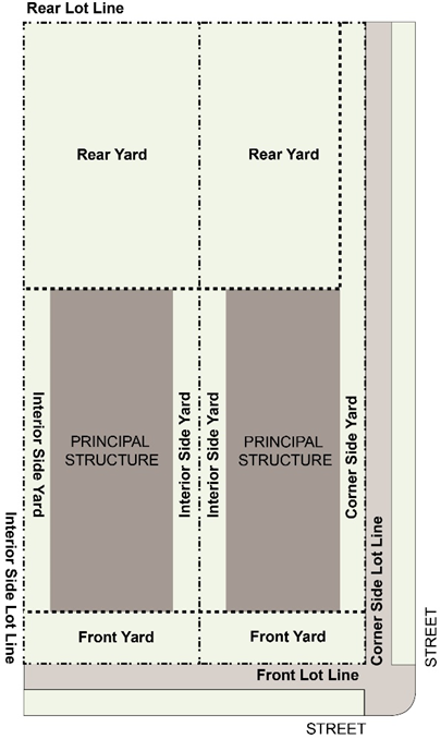 Side Yard: A yard extending along a side lot line from the front yard to the rear yard with a depth extending to the side edge of the principal structure. See Figure 13.02-31 Yard Diagram.