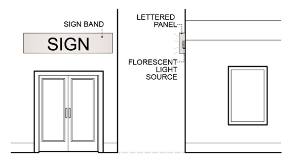 Cabinet or Box Sign: A lettered panel lit by florescent lighting behind. See Figure 13.02-4 Cabinet or Box Sign.