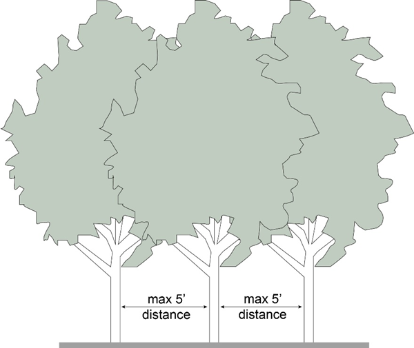 Cluster of Trees: A minimum of three trees which stand together within five feet of each other. Cluster of trees do not refer to the vertical branches which break from the trunk of the tree at ground level. See Figure 13.02-7 Cluster of Trees.