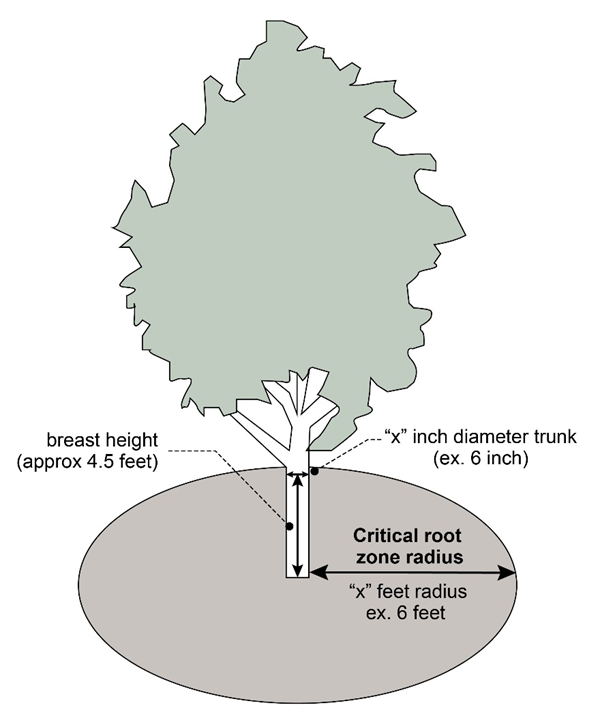 Critical Root Zone: An area on the ground extending out from the trunk of a tree in all directions with a distance of one foot for every one inch of tree diameter at breast height. See Figure 13.02-8 Critical Root Zone.