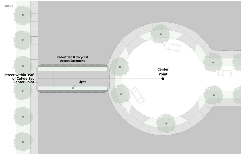 Minimum Connections. New subdivisions must provide connections to existing bicycle or pedestrian paths at a minimum of every 800 feet along blocks that are adjacent to developable land.