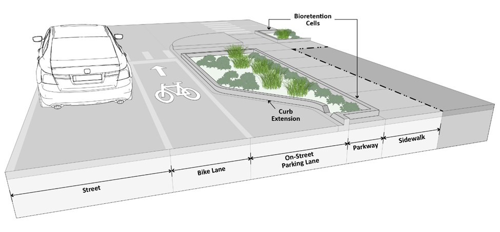 Curb Extensions. Curb extensions must be installed at the intersections of all street types that contain an on-street parking lane adjacent to the curb, to support pedestrian safety. Curb extensions may contain landscaped bioretention cells to facilitate stormwater infiltration and meet the requirements of Section 7.04.D.4 (Parkways and Stormwater Management Facilities).