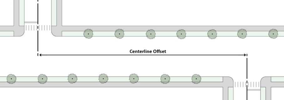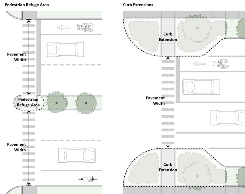 Pedestrian Crossing Distances. Crosswalks with a crossing distance of 38 feet or more must include median pedestrian refuge areas, curb extensions, or other acceptable pedestrian facilities in the right-of-way to improve pedestrian safety by reducing the crossing distance. Refer to Figure 7.04-4 Pedestrian Crossing Distances.