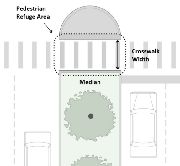 Median Pedestrian Refuge. At any intersection requiring a pedestrian to cross more than three vehicle lanes, a median pedestrian refuge must be installed to provide adequate pedestrian safety. The pedestrian refuge cut-through or ramp must be the same width as the crosswalk. Refer to Figure 7.04-5 Median Pedestrian Refuge Design.