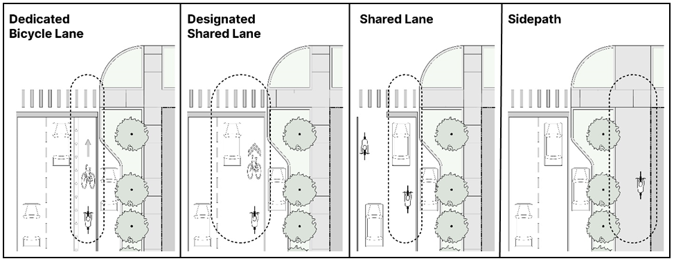 Bicycle Lanes. New streets in subdivisions must include on-street or off-street bicycle facilities in conformance with the City's Complete Streets Policy and relevant planning documents. Three types of on-street bicycle facilities are permitted, and one type of off-street bicycle facility is permitted. The option that promotes the highest level of pedestrian safety possible must be implemented. Designs other than those specified in this Ordinance may be considered. Refer to Figure 7.04-7 Bicycle Lanes for examples.