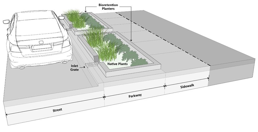 Parkways and Stormwater Management Facilities. Stormwater management facilities approved by the City Engineer must be integrated within the parkway of all street types to help clean and infiltrate stormwater runoff (refer to Figure 7.04-8 Bioswale Design, Figure 7.04-9 Bioretention Planter Design, and Figure 7.04-10 Bioretention Curb Extension Design).