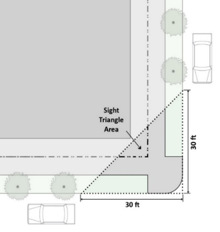 Obstruction of Visibility Prohibited. No building, structure, or sign may be erected or placed, or vegetation allowed to grow in a manner that will create a visibility obstruction for motorists, bicyclists, or pedestrians along or over public rights-of-way. No building, structure, sign, or vegetation may obstruct the area between 2.5 feet and 8 feet in height within the sight triangle area. The sight triangle area is measured along 30 feet of curb line or edge of pavement where no curbs are present, from the point where two or more streets intersect, or where a street intersects railroad tracks. (See Figure 8.05-1 Visibility Obstruction)