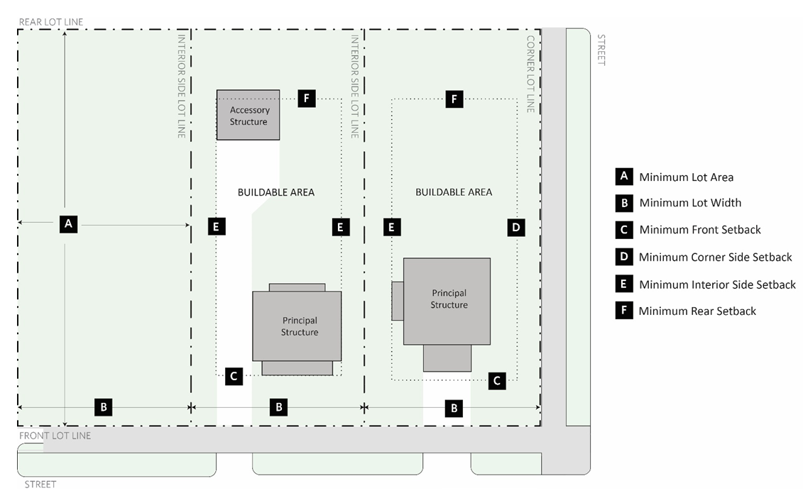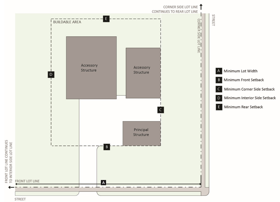 Table 8.10-1 Residential Zoning District Requirements and Figure 8.10-1 Residential Zoning District Requirements establish bulk and setback regulations for the R1, R2, R3, R4, and R5 Districts. See Section 9.03 (Accessory Uses and Structures) for provisions related to accessory structures.