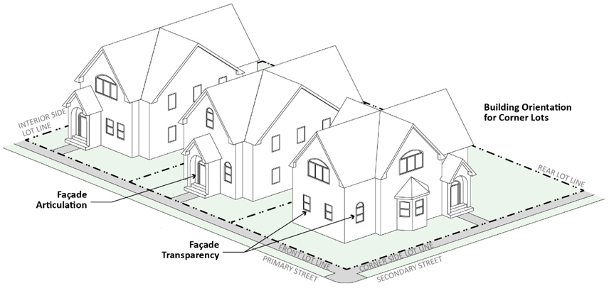 Building Orientation for Corner Lots. The entrance to single-unit, two-unit, three-unit, and four-unit dwellings located on corner lots must have a relationship with both intersecting streets in a manner that maintains the existing street wall on both streets to the greatest extent possible.