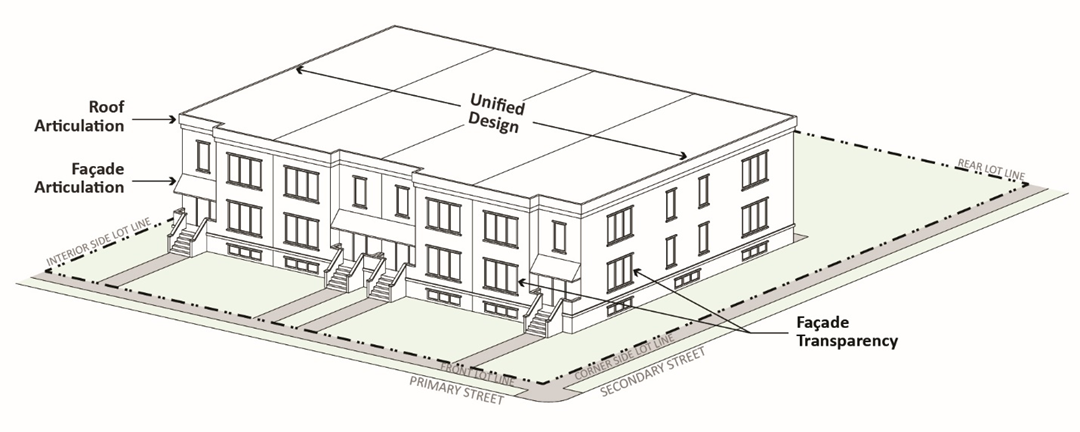 Façade Articulation. To avoid the appearance of blank walls, façades facing the front yard and corner side yard must include façade articulation, such as entrances, bay windows, porches, or other architectural features.