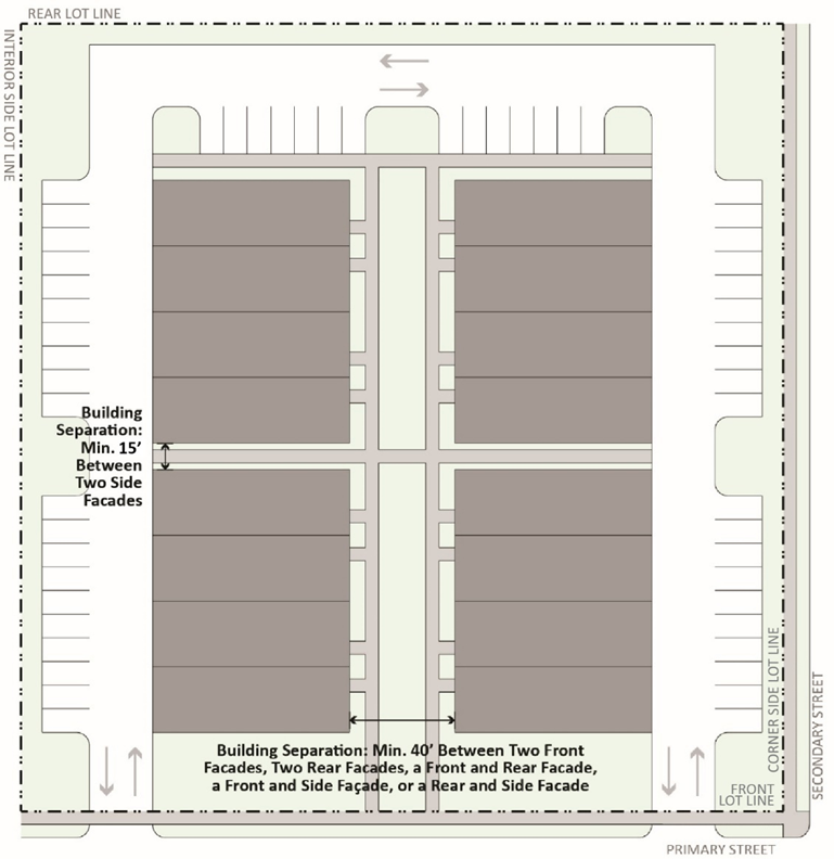 Building Separation. In developments with more than one building, there must be a minimum separation of 40 feet between two front façades, two rear façades, a front and rear façade, a front and side façade, or a rear and side façade. There must be a minimum separation of ten feet between two side façades. Walkways, driveways, and parking areas may be located within the minimum building separation areas.
