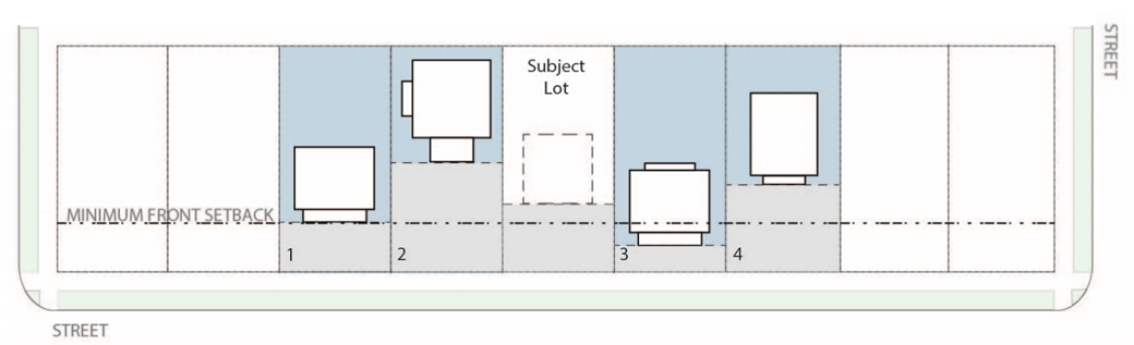 Lots to Be Included. The average front setback must include the four lots closest to the subject lot that are on the same side of the block as the subject lot.