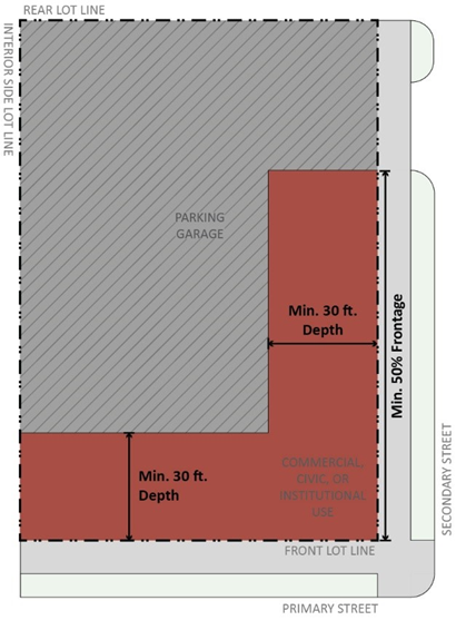 Ground Floor Uses. In the B4 District, an allowed commercial, civic, or institutional use must occupy the first 30 feet of building depth only on the ground floor of a parking garage along a minimum of 50 percent of the street-facing façade, in accordance with Figure 8.13-1 Parking Garage Setback.