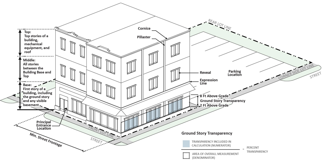 Façade Transparency. Minimum transparency is required on façades facing the front yard, corner side yard, and interior side yard. Minimum transparency of 25 percent is required on façades facing the front yard and corner side yard. Minimum transparency of ten percent is required on façades facing the rear yard.