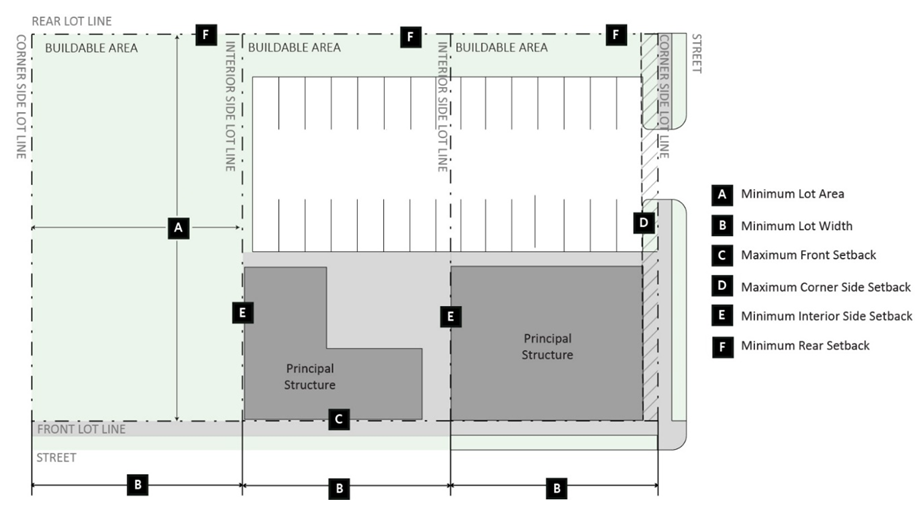 Minimum Street Frontage. The minimum proportion of a principal building required to be located adjacent to a right-of-way expressed as a percentage of the total length of the lot line adjacent to the right-of-way.