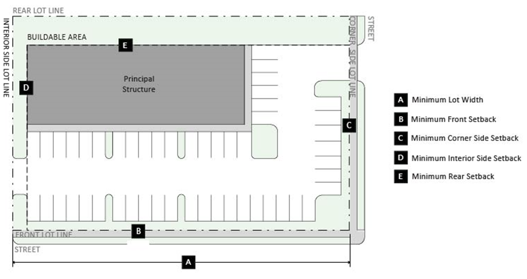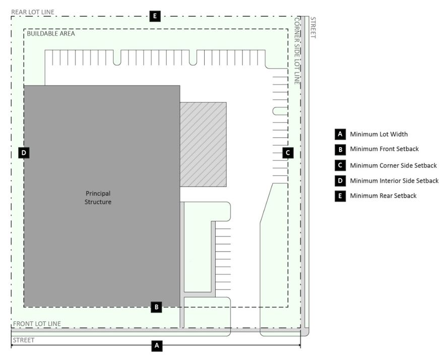 Table 8.14-1 Business District Requirements and Figure 8.14-1 Business District Requirements establish bulk and setback regulations for the Business Districts. See Section 9.03 (Accessory Uses and Structures) for provisions related to accessory structures.