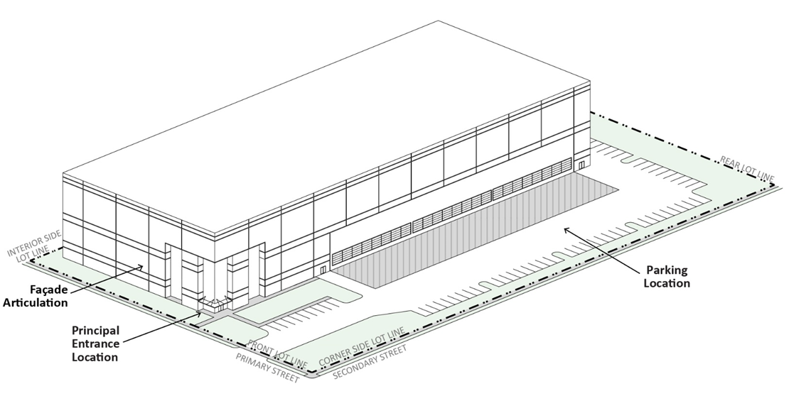 Principal Entrance Location. The façade on which the principal building entrance must be located.