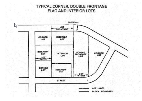 125. "Lot, Double Frontage." A parcel of land, other than a corner lot, with frontage on more than one street or with frontage on a street and a navigable body of water. (See example in illustration No. 1.)