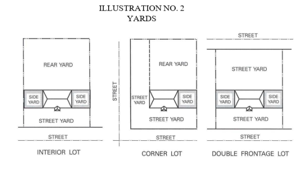 203. "Yard, Street." A yard extending across the full width of the lot, the depth of which shall be the minimum horizontal distance between the existing or proposed street or highway line or right-of-way and a line parallel thereto through the nearest point of the principal structure; provided, if the proposed location of the right-of-way line of such street as established on the Thoroughfare Plan or on the "Official Map of the City of Waukesha" differs from that of the existing street, the required front yard depth shall be measured from the right-of-way line of such street as designated on the Thoroughfare Plan or Official Map. Corner lots and double frontage lots have two such yards. (See example in Illustration No. 2.)