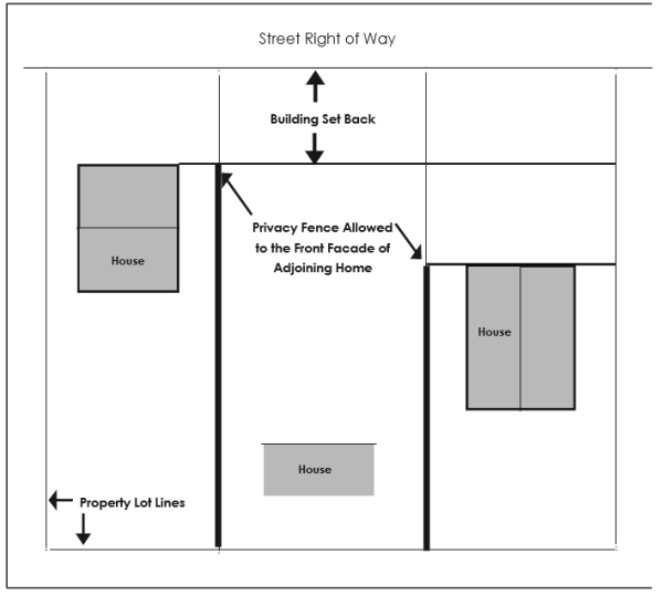 - On residential lots having only one street frontage, Solid Fences are permitted only in Side Yards and Rear Yards, but may extend into the Street Yard as far as the line of the front of the house in an adjoining lot (see Illustration 4).
