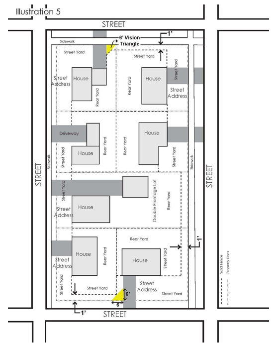 - On residential lots having two street frontages (for example, a comer lot or a lot having street frontage at both the front and the rear), Solid Fences are allowed in Side Yards, and Rear Yards. For purposes of this subsection, only the Yard fronting the street that is the property's address is deemed to be a Street Yard; Solid Fences are permitted in the Yard fronting a street that is not the property's address (see Illustration 5).