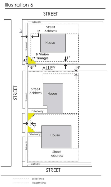 - Solid Fences shall provide for a vision triangle 6 feet on the right-angle sides at driveways and alleys (see Illustration 6).