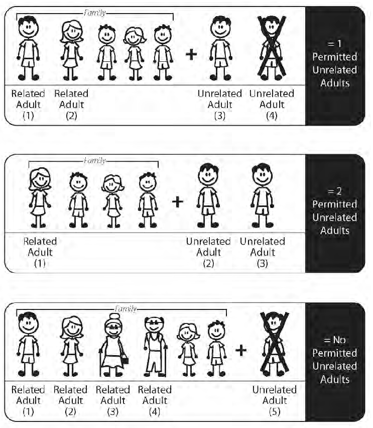 Roommate living arrangement: A residential land use in which a dwelling unit is shared by four or five adults who are not members of the same family.