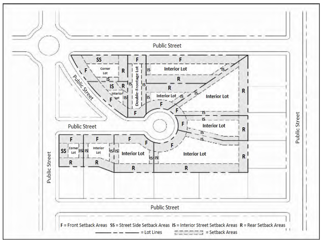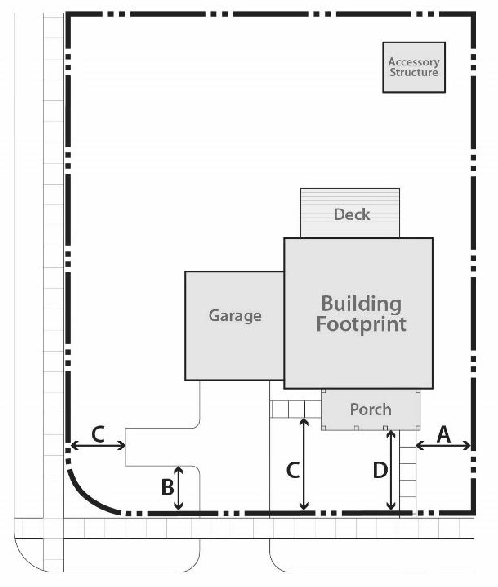 Pavement setback: The area between the nearest right-of-way or lot line and any impervious surfaces on the lot. This setback does not apply to driveways, driveway entrances, public sidewalks, or sidewalks perpendicular to the street right-of-way on private property. See Figure 23.01.23e.