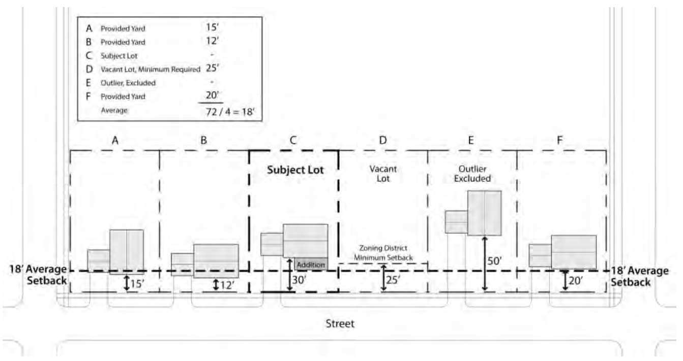 Outliers, defined as yards with a setback that is equal to or greater than twice that of the next largest setback among the adjoining lots and thus which do not fit the established pattern of front yard setbacks, shall be excluded in calculating the mean front yard setback, as determined by the Zoning Administrator.