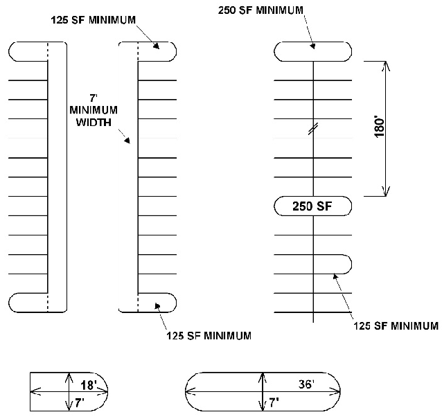 Each landscaped planter island shall be no less than 125 square feet in area and seven feet in width, measured from the back of the curb. For double-parking rows, each landscaped planter island shall be no less than 250 square feet in area. The seven-foot width requirement may be reduced to accommodate the triangular shape resulting from angled parking.