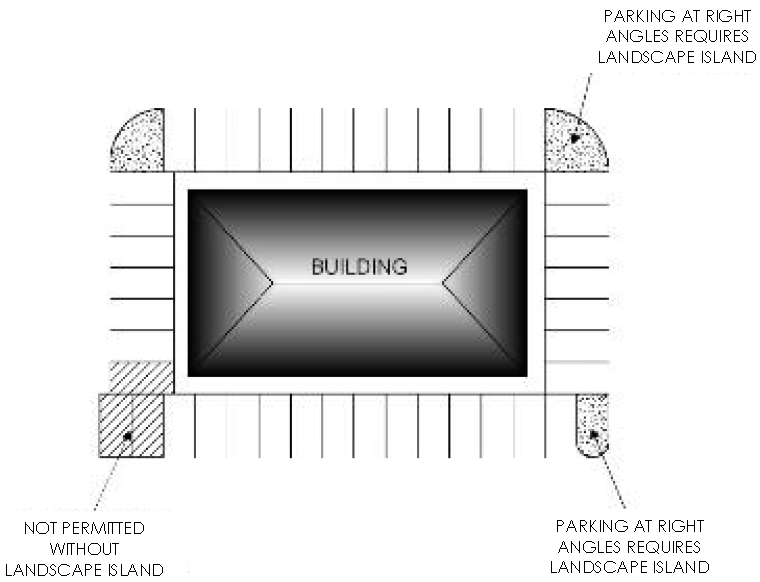 Landscaped planter islands are required where two rows of parking stalls meet at a right angle. See Figure 23.08.30b.