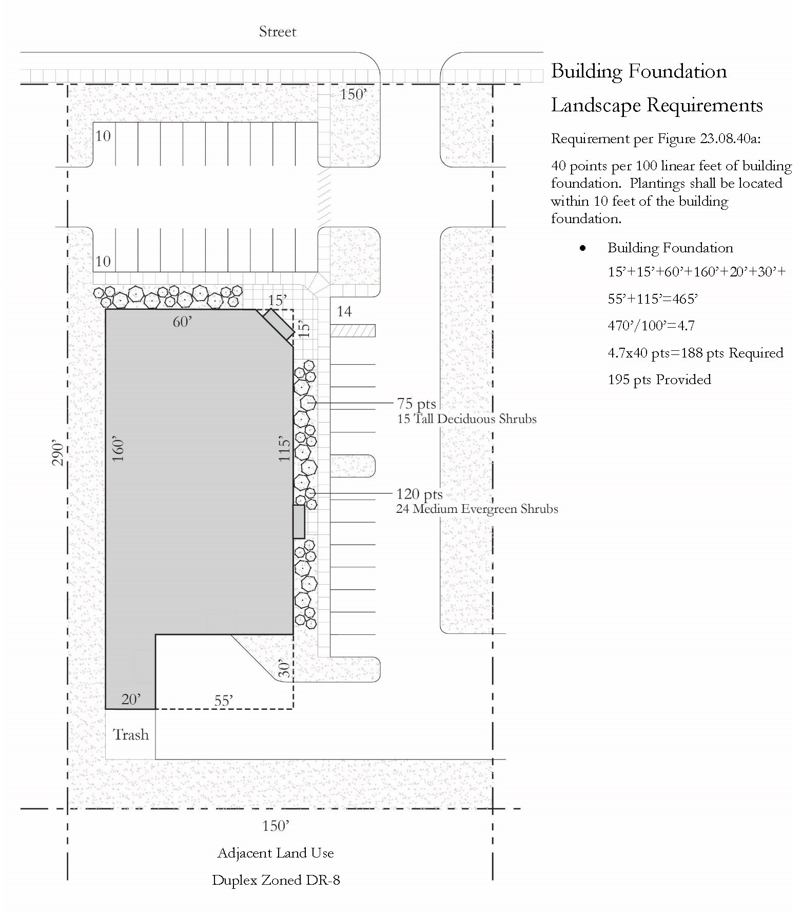 For every 100 linear feet of building foundation, the landscaping installed shall at a minimum meet the number of landscaping points specified in Figure 23.08.30d.