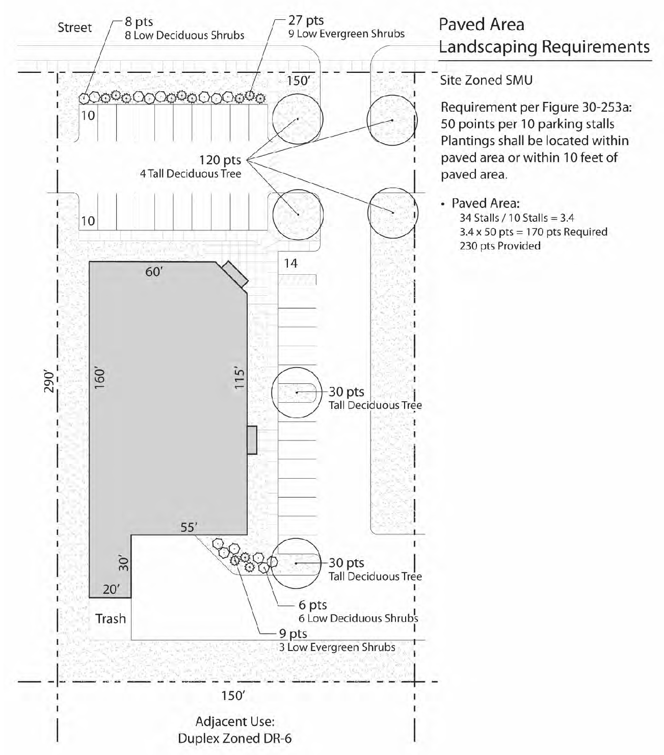 For every ten off-street parking stalls or 10,000 square feet of pavement (whichever yields the greater landscaping requirement), landscaping shall at a minimum meet the number of landscaping points specified in Figure 23.08.30d.