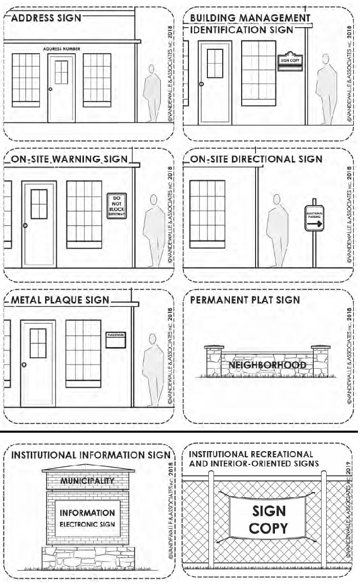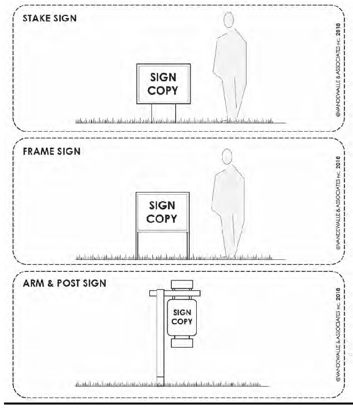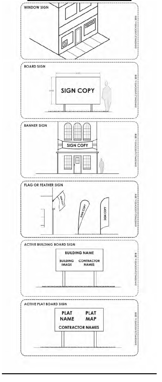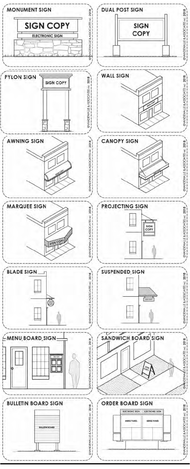 This section provides the definitions and rules related to various sign groups, sign categories, and sign types. Figures 23.09.11a through 23.09.11d provide the regulations for these signs applicable to each zoning district. Any sign type not addressed by this title shall be construed to be prohibited.