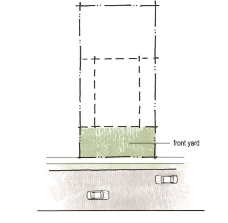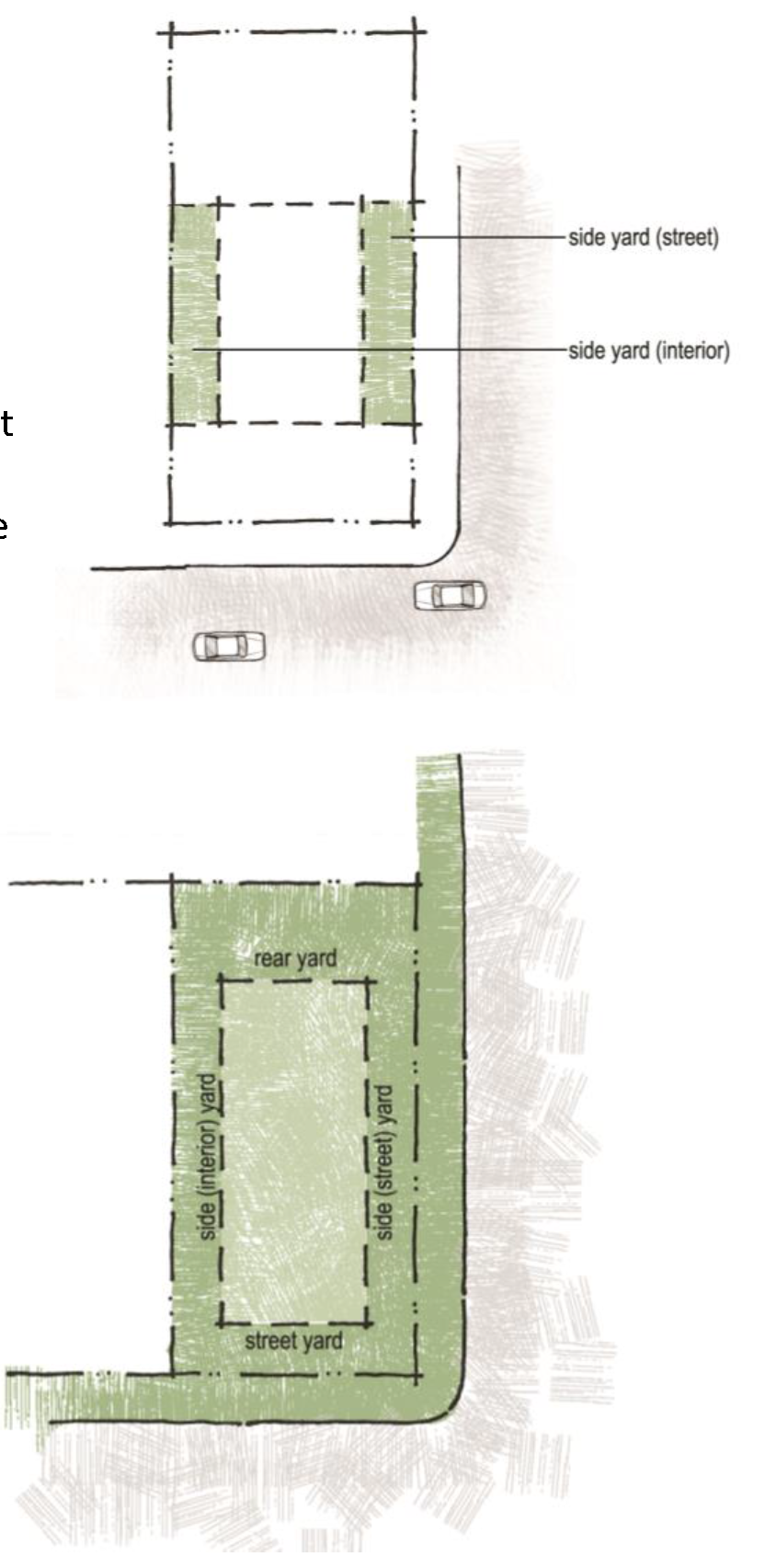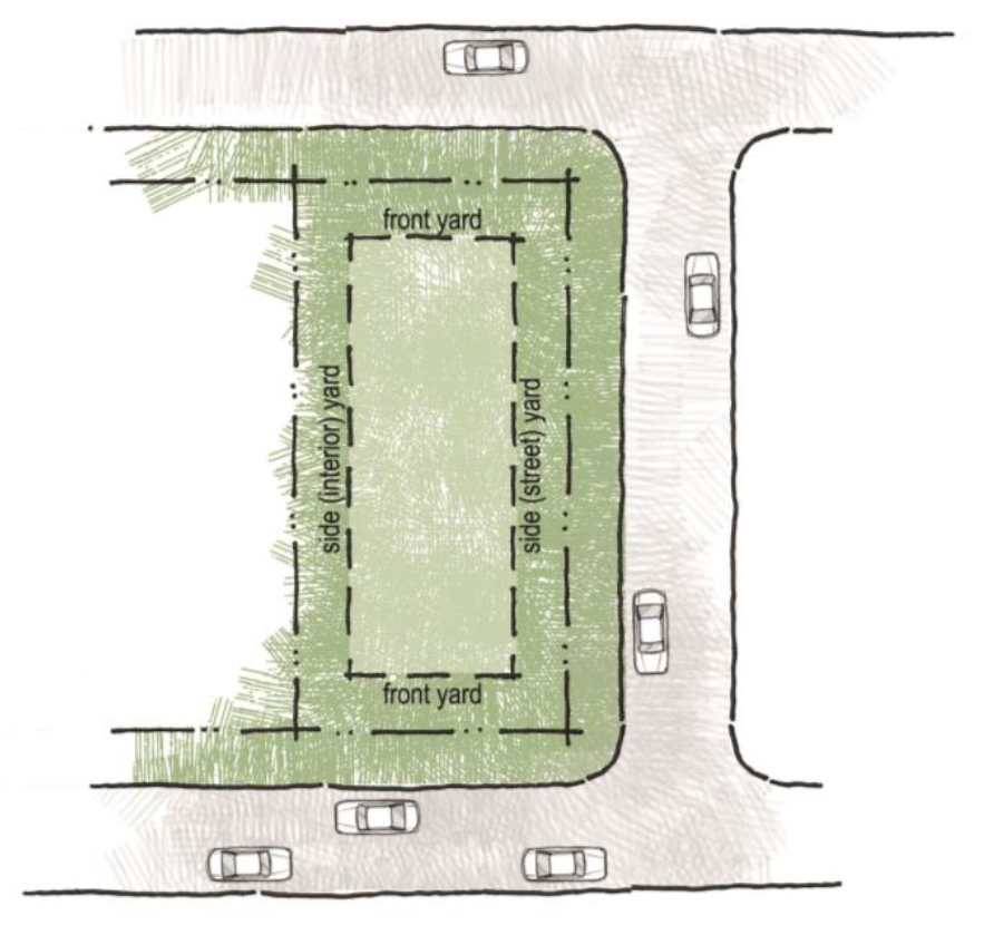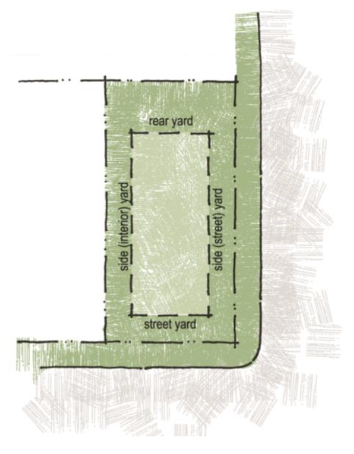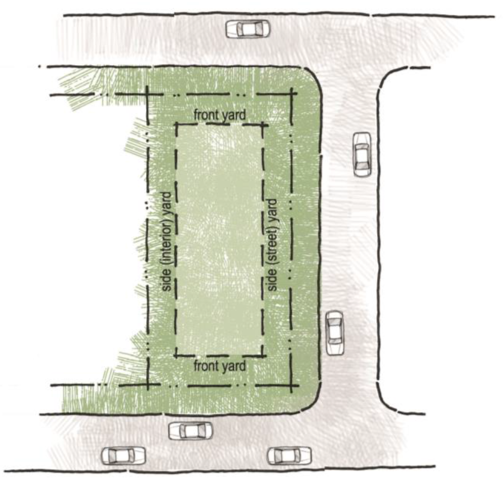 There are four types of required yards—Front, side (street), side (interior) and rear yards.